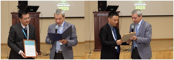 AMPL脉冲激光器和激光应用系列国际会议,每两年在托木斯克举行一次。今年的会议意义尤为特殊,会上纪念了弗拉基米尔·祖耶夫院士诞辰100周年,他是俄罗斯脉冲激光器和激光应用研究的奠基人,也是俄罗斯科学院大气光学所的创始人和第一任所长(1969年),同时也是国际会议的发起人。为感谢中方机构对中俄大气光学领域国际合作和祖耶夫院士百年诞辰纪念会作出的贡献,俄罗斯科学院大气光学所所长伊戈尔·帕萨尼克代表托木斯克科教组织联盟为安徽光机所刘东研究员和王珍珠研究员颁发了致谢证书。