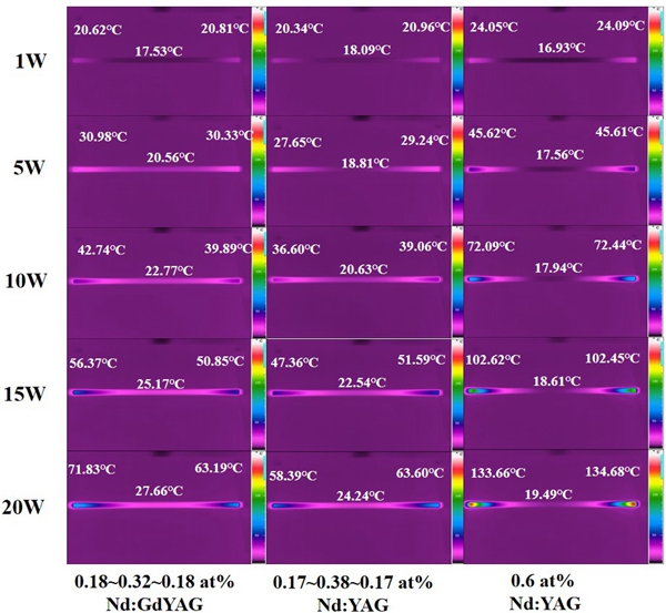 固体激光技术中,激光增益介质的热效应是限制激光性能提升的技术瓶颈之一。激光运转过程中晶体元件温度分布不均匀是产生热效应的主要原因。目前,改善激光晶体热效应的方法主要包括优化晶体形状、调整泵浦模式以及改进冷却方式等。研究团队前期通过类泡生方法生长了不同梯度浓度Nd3+掺杂的激光晶体,并对单端泵浦的梯度浓度晶体进行了激光性能和光谱性能研究,研究结果证实梯度浓度激光晶体可有效提高泵浦吸收的均匀性,改善热效应。