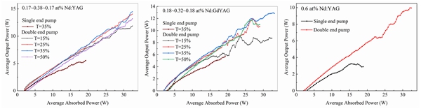 激光性能:(a)0.17~0.38~0.17 at% Nd:YAG;(b)0.18~0.32~0.18 at% Nd:GdYAG;(c)0.6 at% Nd:YAG