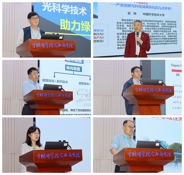 特邀讲座中,中国工程院院士、安徽光机所学术所长刘文清以“光科学技术助理绿色科技赋能”为题,系统阐述光科学技术在绿色科技赋能中的作用,介绍了安徽光机所等科研院所在大气环境监测领域的技术突破与成果应用;南方科技大学邵理阳教授线上分享“AI赋能的光电融合感知与产业应用”,展示智能分布式光纤传感技术在多领域的创新应用;长三角院士科技创新研究院吴林副院长则聚焦“AI时代—产业创新与科技成果转化的几点思考”,结合实践经验探讨科技与产业深度融合路径。此外,来自山西大学、安徽大学、山东大学、安徽建筑大学、中国科学技术大学、国防科技大学等高校及科研院所的专家、企业专家,围绕高功率激光器、量子级联激光光谱、二维材料红外探测器等主题作专题授课,呈现光学领域最新研究进展。此外,还有近20位学者到会分别就激光构筑纳米材料、太赫兹参量源、气体检测光谱技术等方向分享研究技术成果,现场交流氛围热烈。